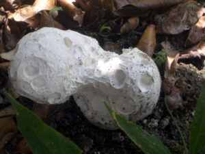 うちの庭の片隅に発泡スチロールの塊のようなキノコが生えているのを前住職が発見した。大きさは20cmくらい。最初に発見した時は小さな塊だったものが、あれよあれよという間に成長したらしい。